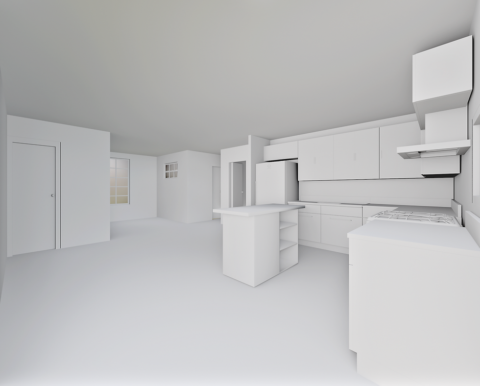 3D model illustrating a new room distribution for an apartment renovation. This concept explores opening up the space with a modern, minimalist layout, including an open-plan kitchen with an integrated private office. The design maximizes functionality while maintaining clean lines and a calm, airy atmosphere, showcasing the apartment’s potential for contemporary urban living.